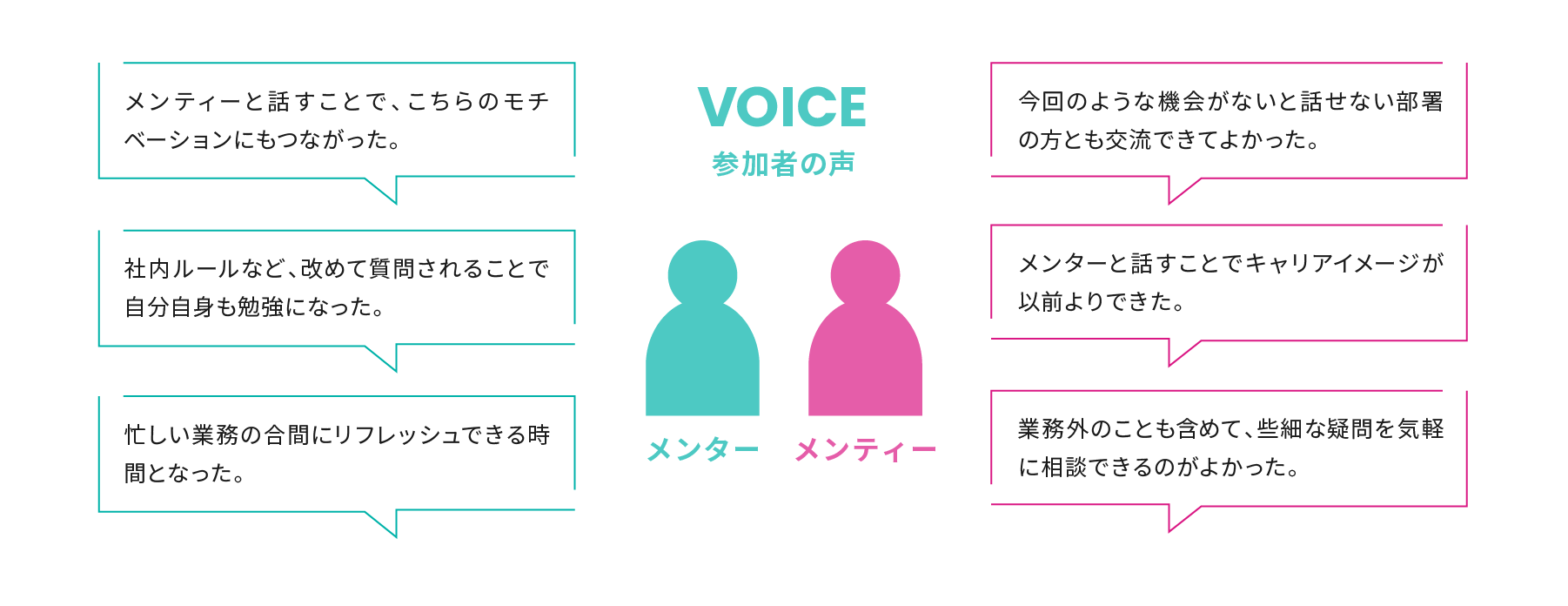 部門を跨いだメンターとメンティーの対話による、社内のつながりの拡大や活性化、早期定着化を目的としています。また仕事のつながりと離れたところで対話することで、プライベートを含め相談ができる環境づくりをおこなっています。