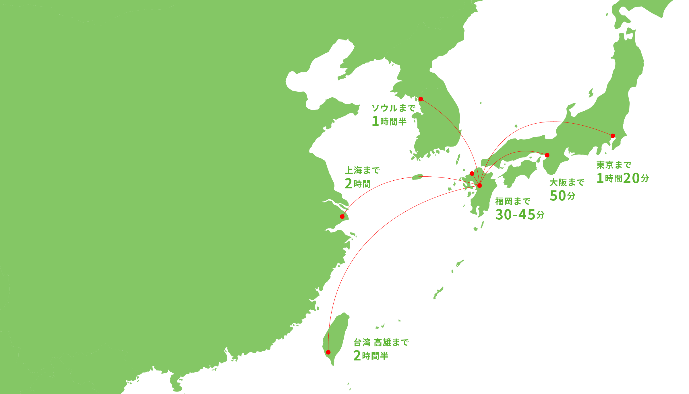 東京エレクトロン九州がある合志市から熊本空港へは、車で約20分。国内主要都市はもちろん、半導体製造の拠点として注目されるアジア圏の都市へも、国内移動と変わらない感覚でアクセス可能です。こうした優れた「機動力」も、当社の強みのひとつです。