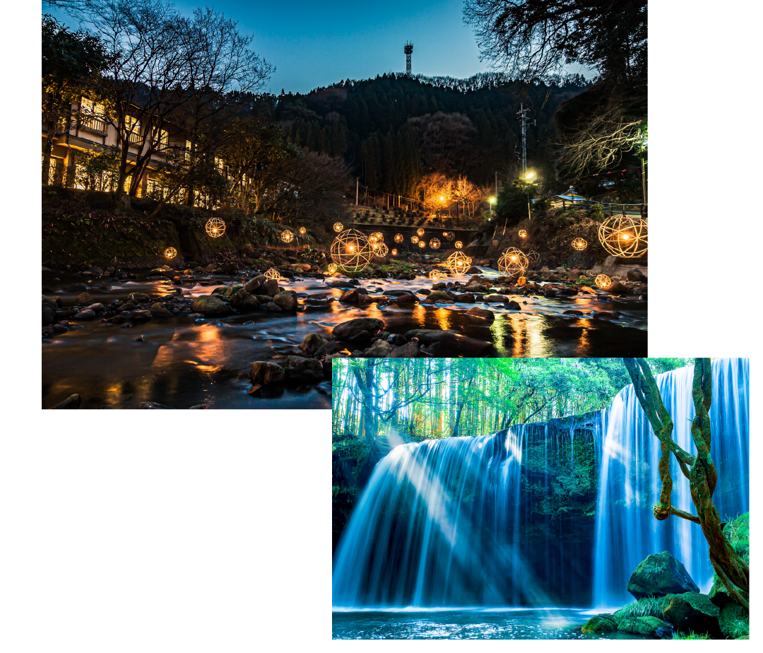 また、黒川温泉にほど近い小国町には、癒しのパワースポットとして人気の「鍋ヶ滝」があります。滝の裏側からも眺められる独特の景観が魅力で、春にはライトアップが行われ、幻想的な雰囲気に包まれます。冬には大きな氷柱が現れ、四季ごとに異なる美しい風景を楽しめる名所です。