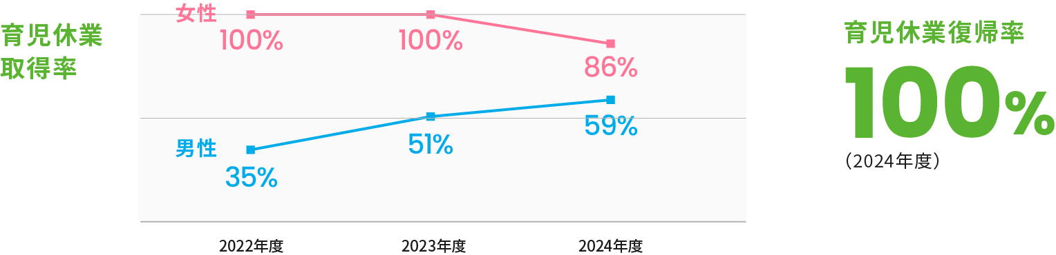 男女関わらず、すべての社員がキャリア形成を継続できるよう、育児支援制度の充実に注力。産前産後休暇、育児休業、子の看護休暇、子育て応援休暇などを整備しています。